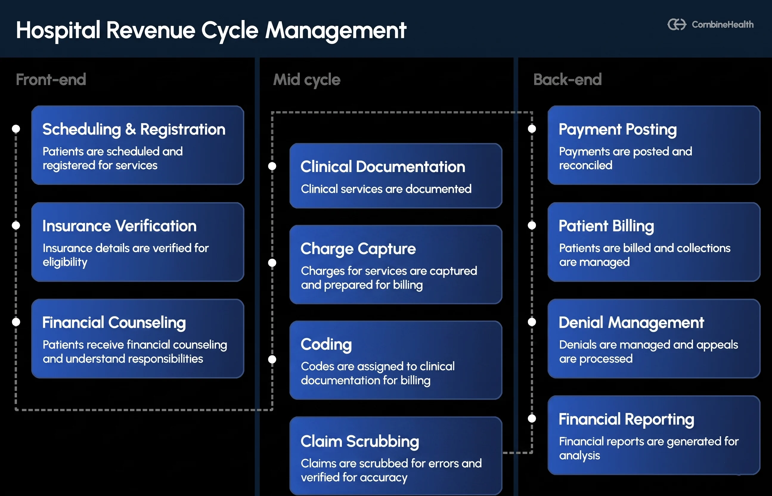 Charge capture sits in the mid-cycle of the revenue cycle. The image below shows how the full RCM workflow breaks down into three phases: