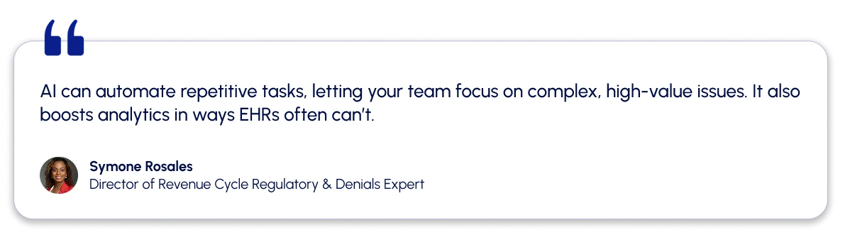 Symone shared an optimistic and realistic take on AI’s usefulness in the denial management process: